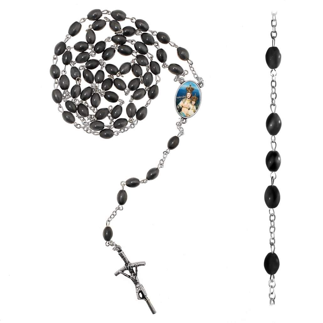 Oval hematite rosary 59 beads 5×7 mm with brass string and chain, metal cross and cruise; silver coated. Optionally cross – cruise 2 photos 12×18 mm