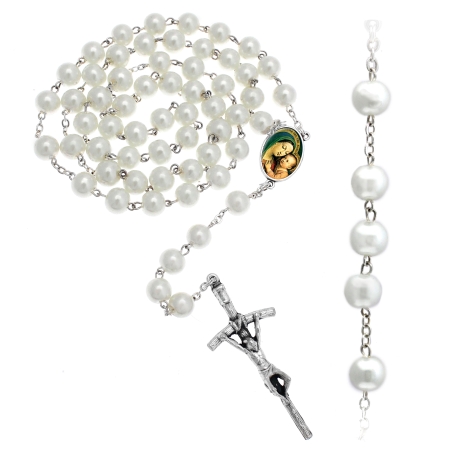 Pearly glass rosary 59 beads Ø 4 mm filo with brass string and chain, silver coated. Optionally cross – cruise 2 photos 12×18 mm