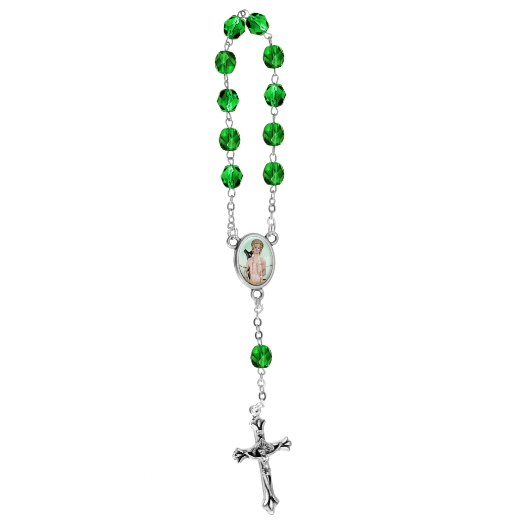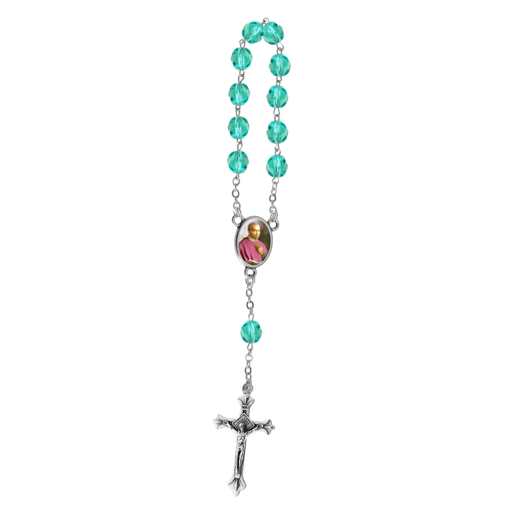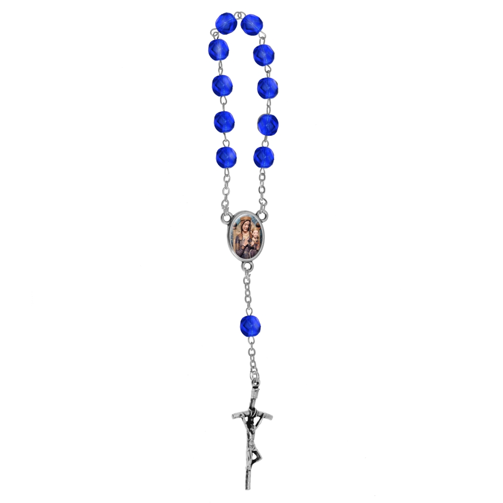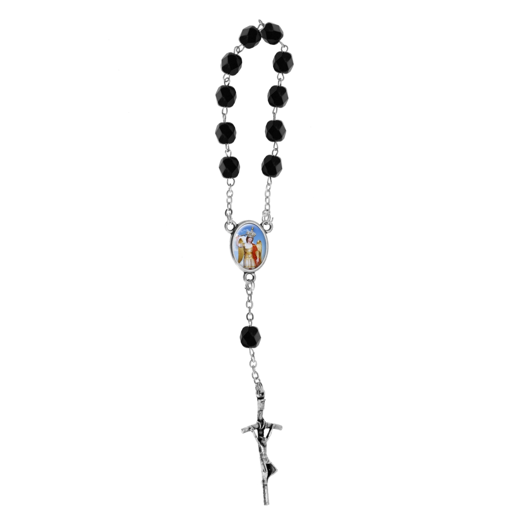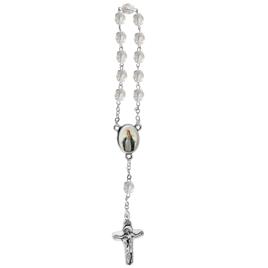 Decenario rosario 1 tramo 11 cuentas en cristal multifacetico Ø 7 mm malla en latón, cruz y centro metalico; todo patinado plata. Cruz a eleccion centro