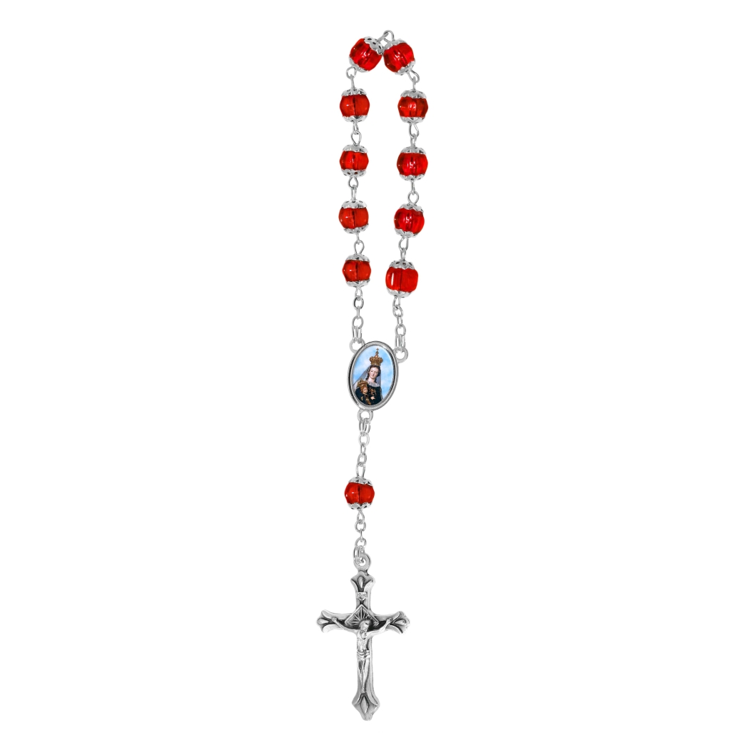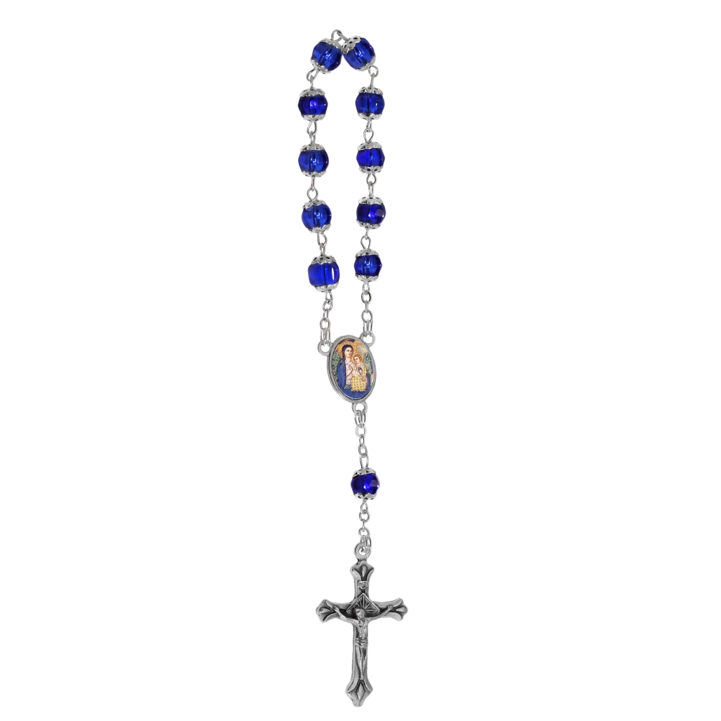Decenario rosario 1 tramo 11 cuentas en vidrio multifacetico acoplado Ø 6 mm malla en latón, cruz y centro metalico; todo patinado plata. Cruz a eleccion – centro
