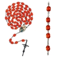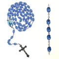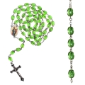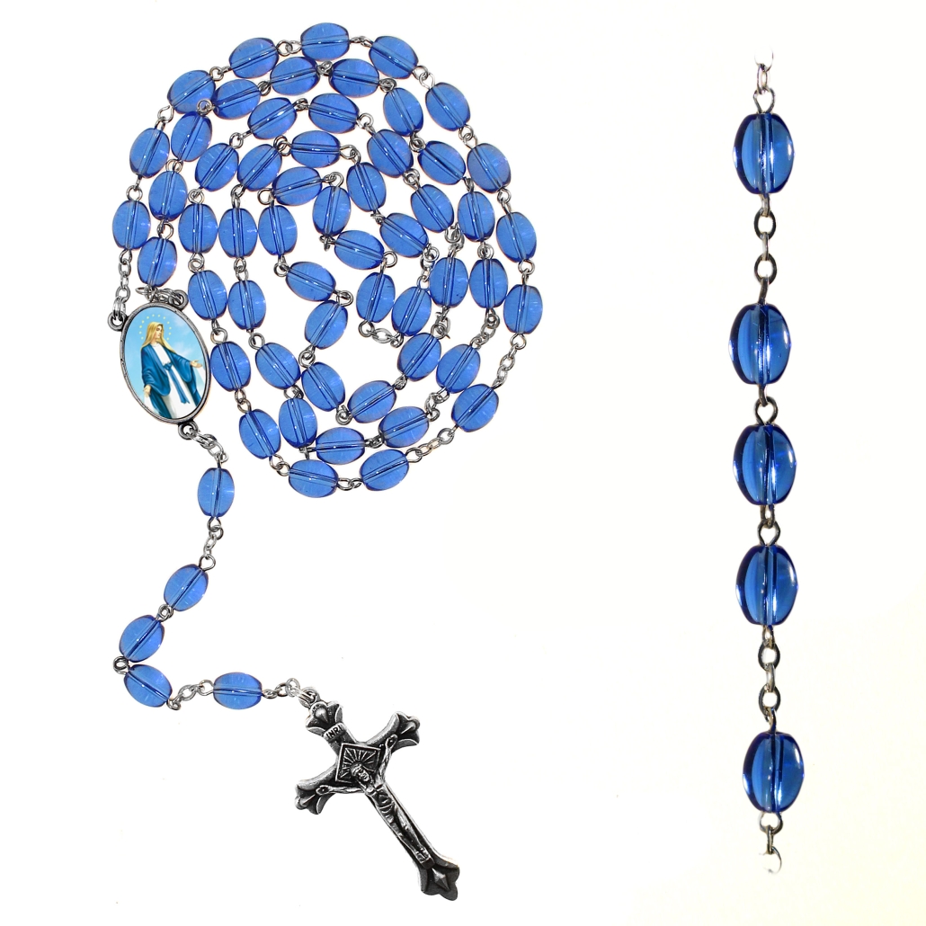 Rosario 5 tramos 59 cuentas en vidrio liso ovalado 7×9 mm cadena en laton, cruz y centro metalico; todo patinado plata.