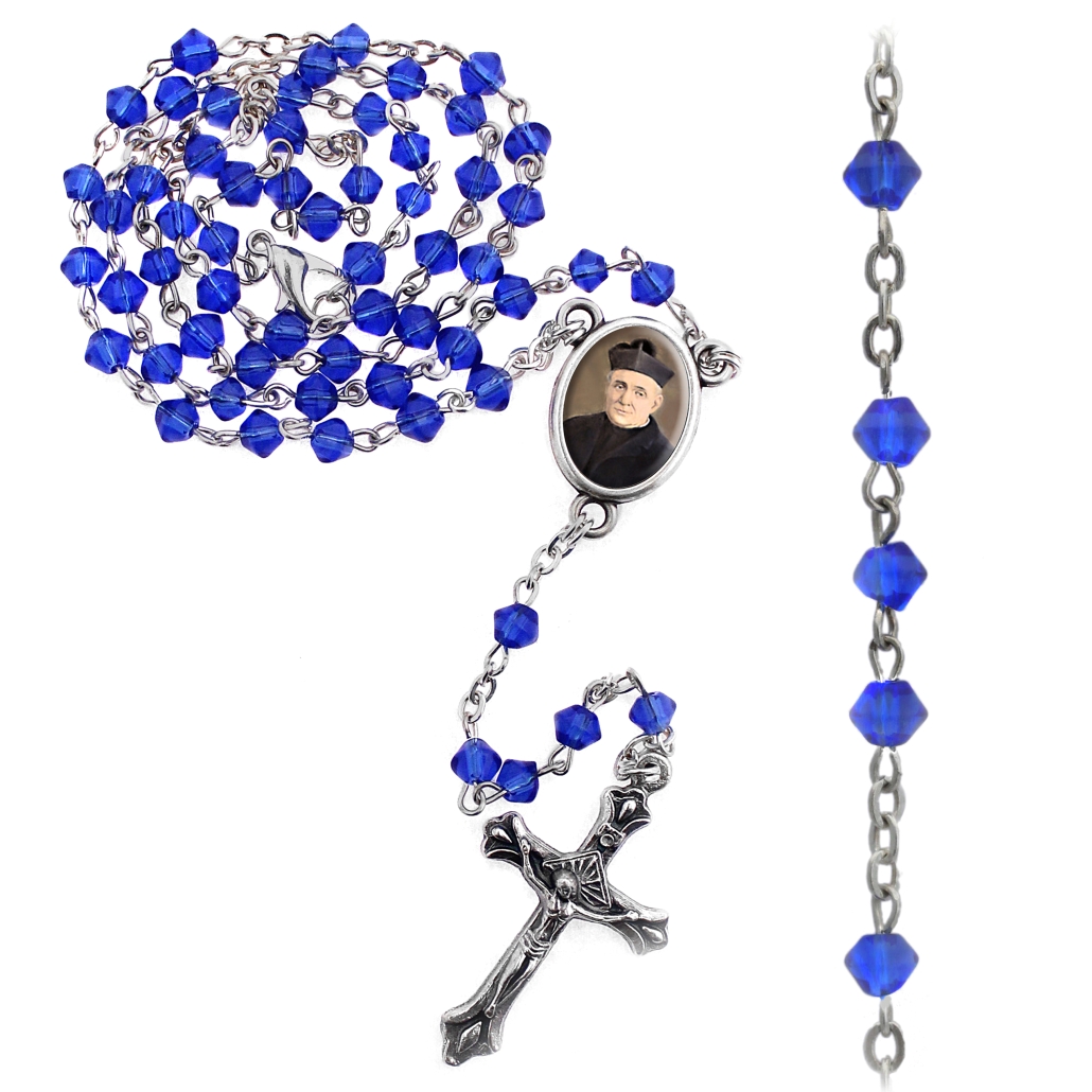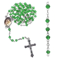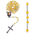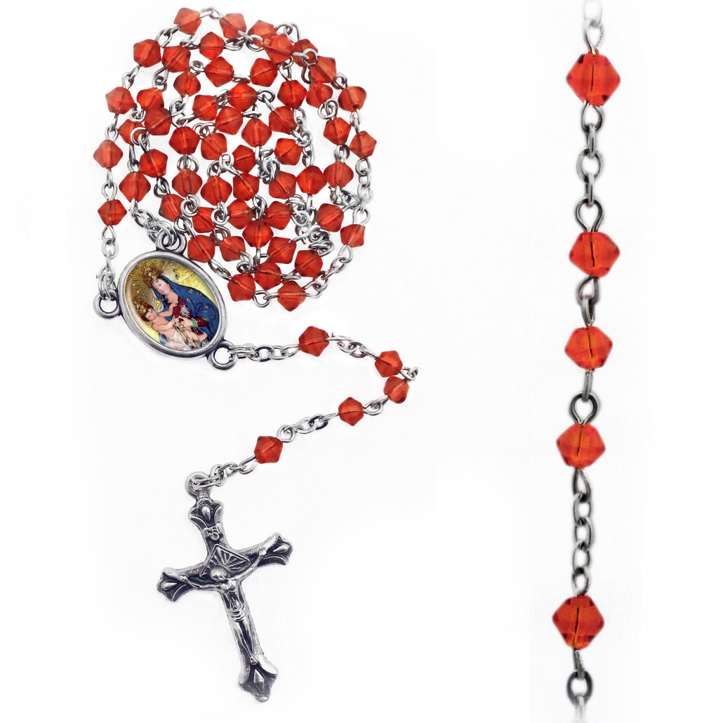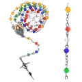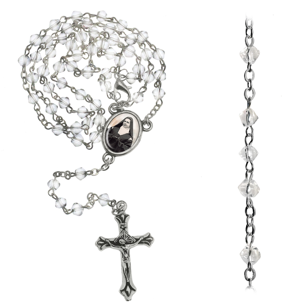 Rosario 5 tramos 59 cuentas en vidrio romboidal Ø 4 mm cadena en laton, cruz y centro metalico; todo patinado plata.