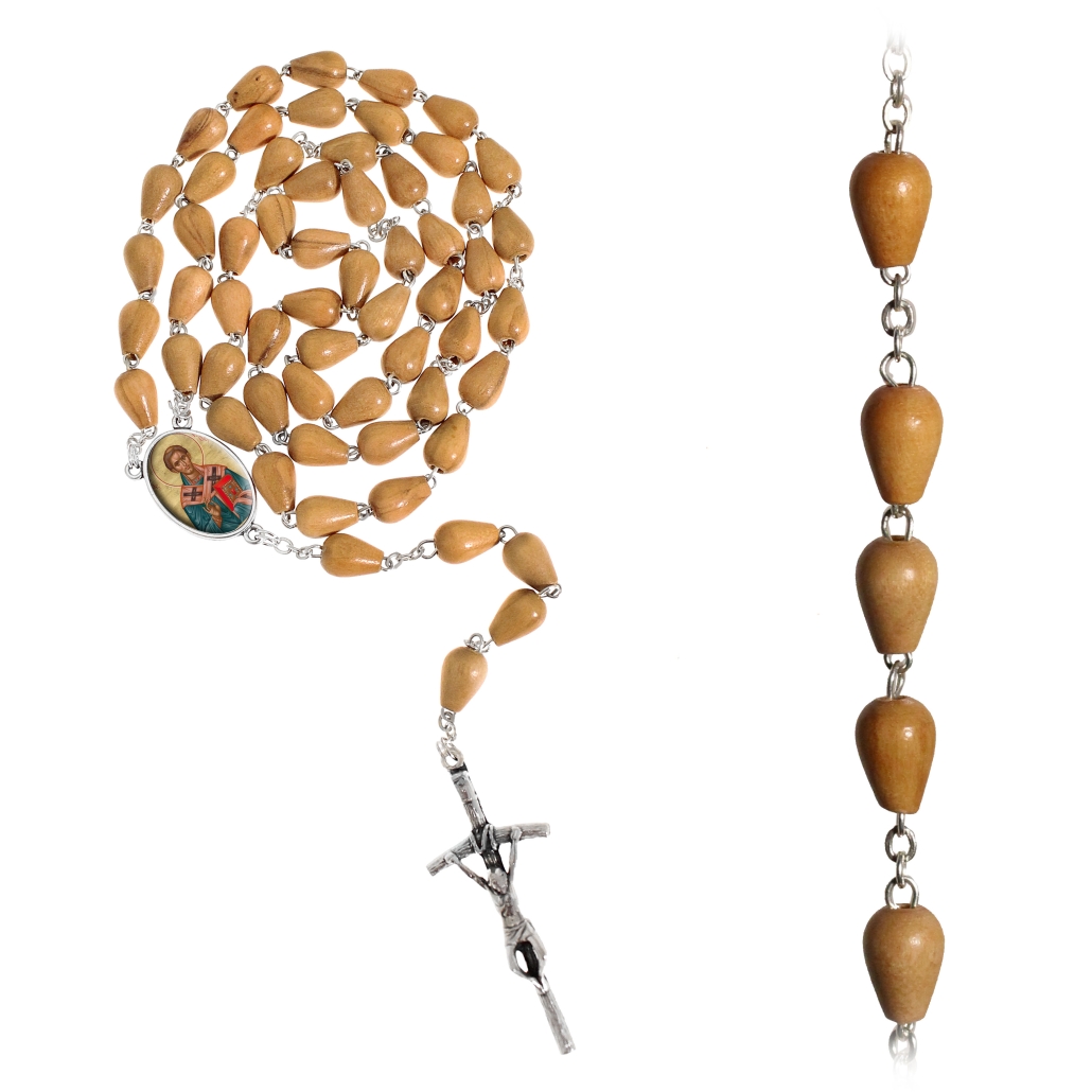 Chapelet 59 perles en bois d’olivier à la forme de goutte 6,5×10 mm avec fil et chaîne en cuivre et croix et croisière en métal; tout patiné argent. Croix au choix – Croisière 2 photos 12×18 mm