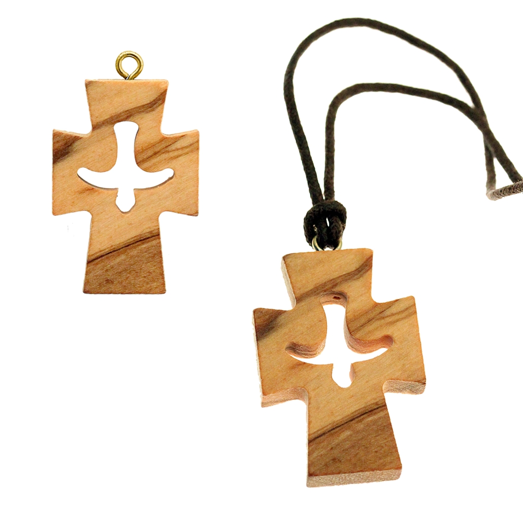 Croix cisellée en bois d’olivier avec le symbole de la colombe 40×27 mm